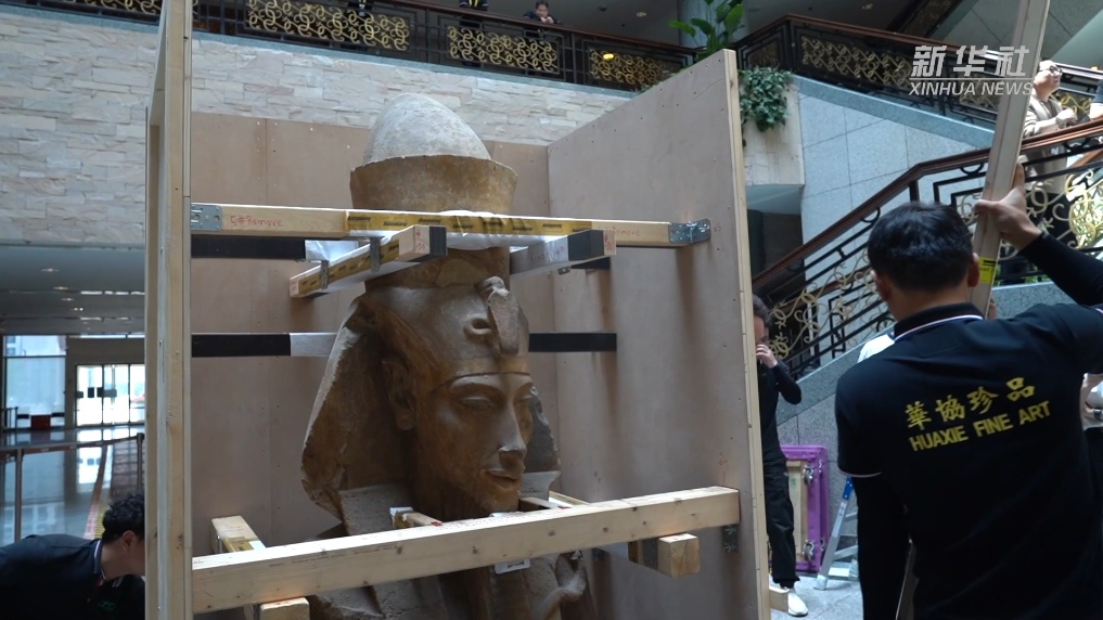 17日,来自埃及国家博物馆的埃赫纳吞巨像、萨卡拉考古遗址的彩绘人形棺率先在上海博物馆人民广场馆进行开箱亮相,拉开“金字塔之巅:古埃及文明大展”的布展序幕。