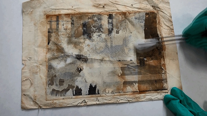 4月28日,经过真空封存的照片被送到了陕西师范大学感光与纸质等多种材质档案保护重点实验室。“照片被粘在两片玻璃之间,相纸老化降解严重,正面影像层已经附着在玻璃上,疏松酥粉、模糊不清,几乎一触即碎。”该重点实验室负责人李玉虎说,“经过研判,我们选择用微米级的液雾喷洒在照片背面,让显现加固剂慢慢渗透到影像层,修复的同时增强照片的强度与韧性。”