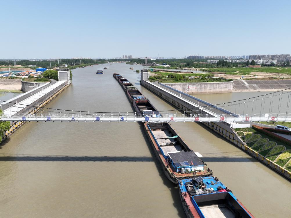 2024年5月28日,船只在京杭大运河航行(无人机照片)。新华社记者 毛俊 摄