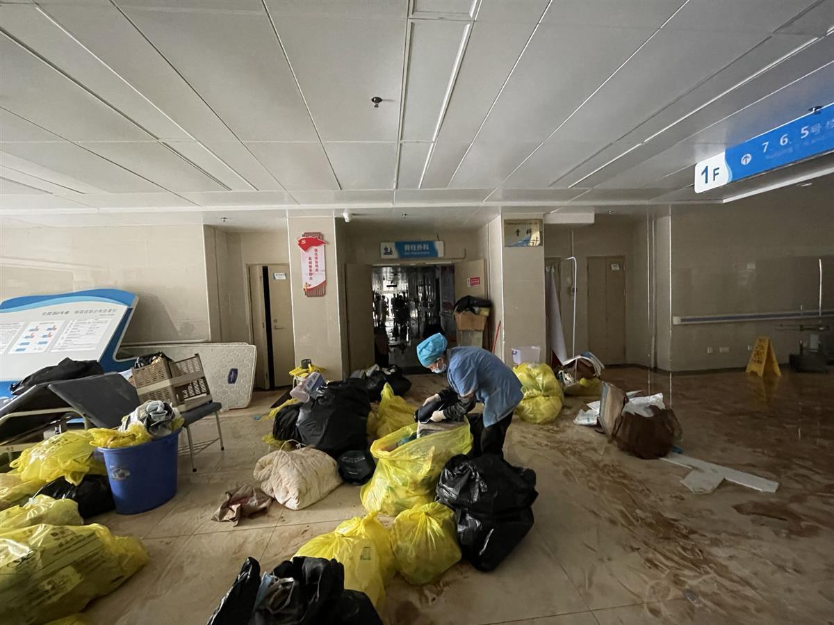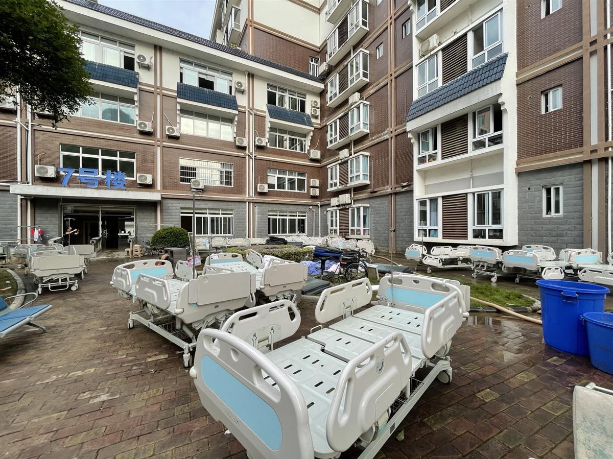 在8号楼门口,医护和工作人员正拉出被泡水的病床,清洗晾晒。住院区的庭院内堆满了泡水后的床单、病号服和病床。工作人员称,将对其进行统一消杀后再使用。