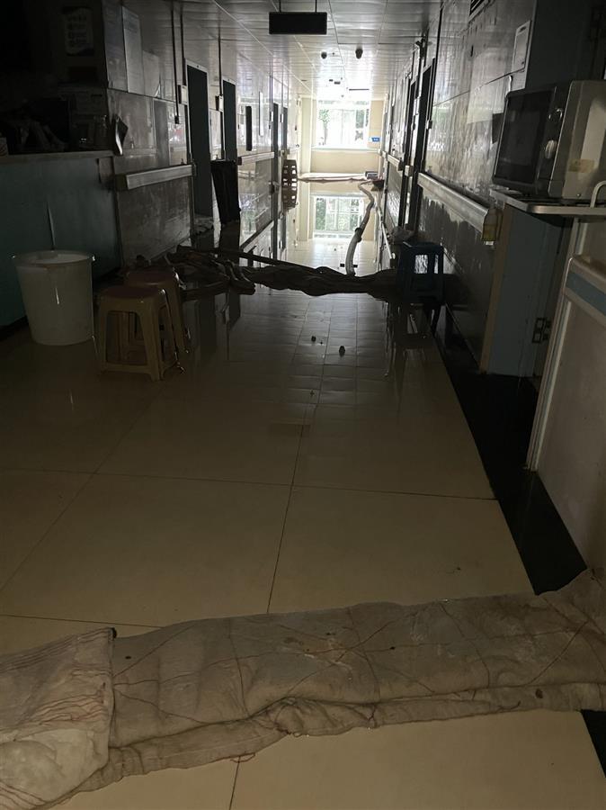 记者走访发现,医院一楼一片漆黑;一楼以上,多数病房仍停水,部分病房依靠发动机临时供电。
