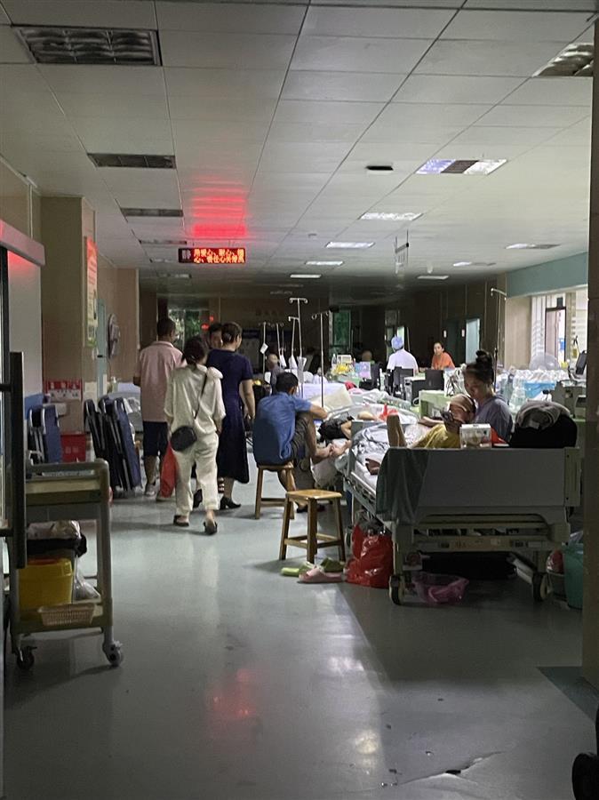 因供电量不足,部分楼层未开放空调。从一楼转移到其他楼层的病患们,大多睡在病房走廊、大厅里。在6月闷热的桂林,有病患干脆脱掉上衣,躺在病床上。