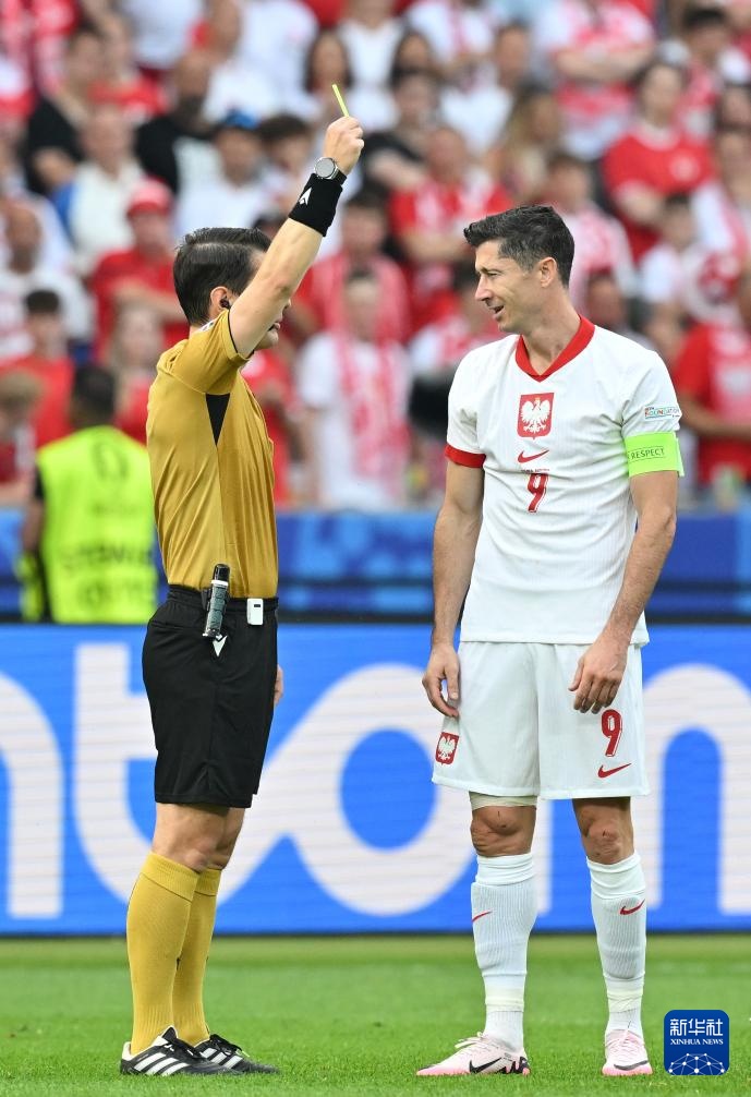 6月21日,主裁判向波兰队球员莱万多夫斯基(右)出示黄牌。新华社记者 任鹏飞 摄