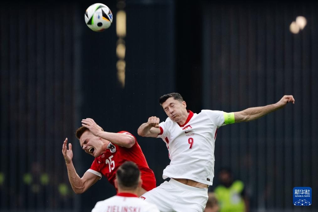 6月21日,波兰队球员莱万多夫斯基(右)与奥地利队球员林哈特争顶。新华社记者 肖艺九 摄