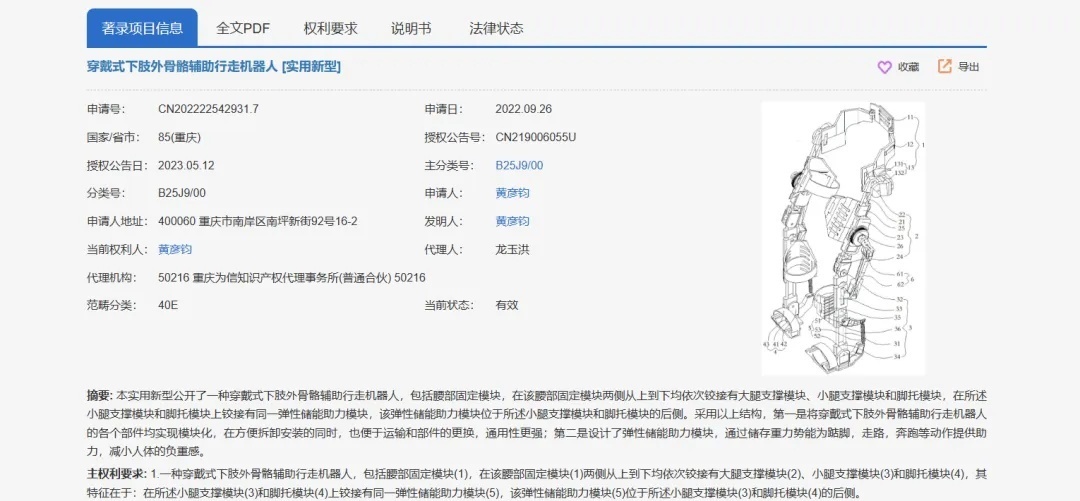 穿戴式下肢外骨骼辅助行走机器人。中国专利信息中心网站截图
