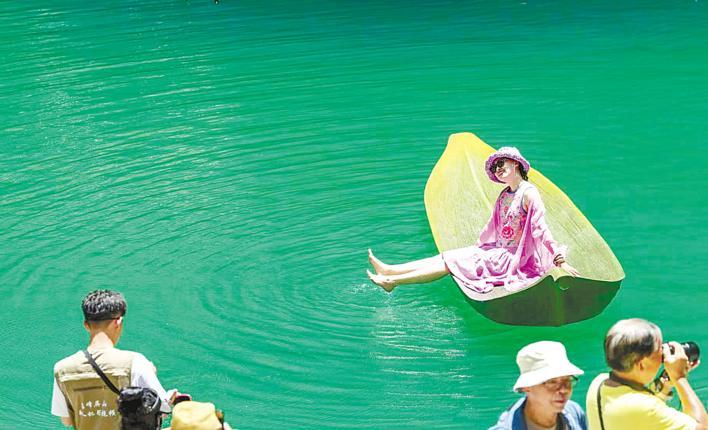 6月18日,在鹤峰屏山景区,广东游客孙芸芸身着苗族特色服饰,一副精致妆容,来到一叶扁舟体验区。坐在箬叶船头,她将脚尖轻轻划过水面,岸边摄影师为她定格下美丽瞬间。