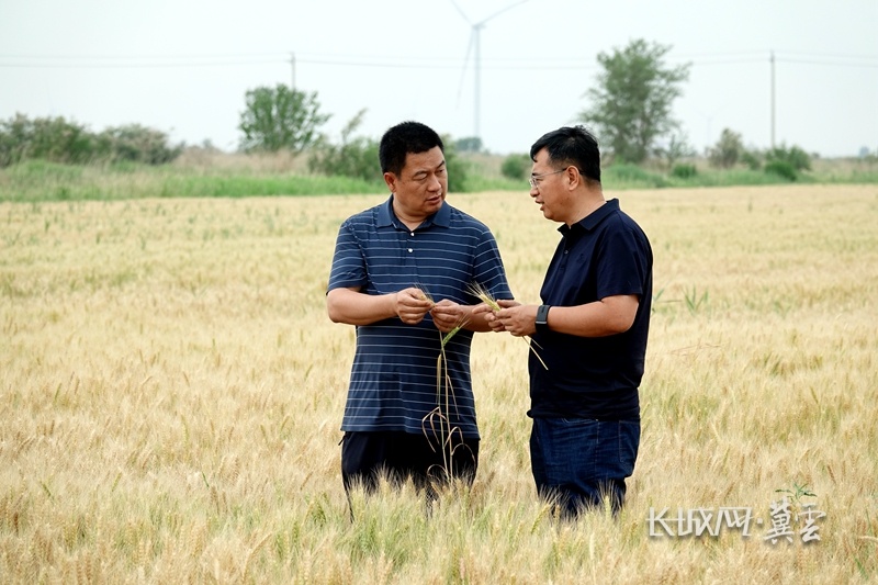 刘振宇(左)与专家交流旱碱麦治理措施。记者 李元华 摄