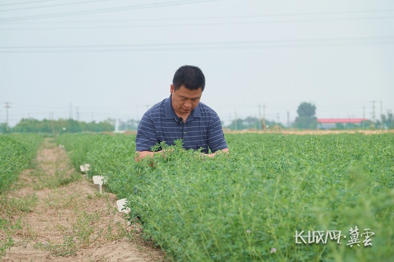刘振宇在试验田里查看苜蓿长势。记者 李元华 摄