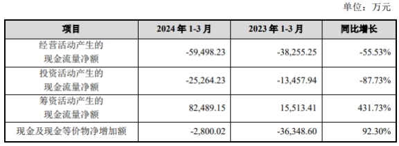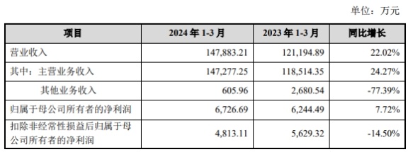 2024年一季度,公司实现营业收入147,883.21万元,同比增长22.02%;归属于母公司所有者的净利润为6,726.69万元,同比增长7.72%;扣除非经常性损益后归属于母公司所有者的净利润为4,813.11万元,同比下降14.50%;经营活动产生的现金流量净额为-59,498.23 万元,上年同期为-38,255.25 万元。