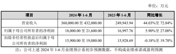 公司预计2024年1-6月业绩实现营业收入360,000.00万元至432,000.00万元,同比增长44.03%至72.84%;归属于母公司所有者的净利润为18,000.00万元至21,600.00万元,同比增长5.90%至27.08%;扣除非经常性损益后归属于母公司所有者的净利润15,900.00万元至19,080.00万元,同比增长-0.18%至19.78%。