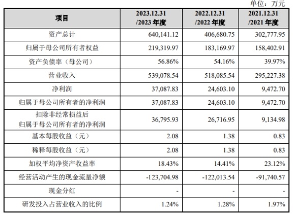 2020年-2023年,永臻股份营业收入分别为143,310.15万元、295,227.38万元、518,085.54万元、539,078.54万元,归属于母公司所有者的净利润分别为4,721.84万元、9,472.70万元、24,603.10万元、37,087.83万元,扣除非经常损益后归属于母公司所有者的净利润分别为3,003.35万元、9,134.98万元、26,716.95万元、36,795.93万元,经营活动产生的现金流量净额分别为-28,682.87万元、-91,740.57万元、-122,013.54万元、-123,704.98万元。