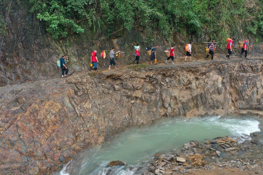 6月25日,夷望溪镇的志愿者队伍在山间徒步运送物资。新华社记者薛宇舸 摄