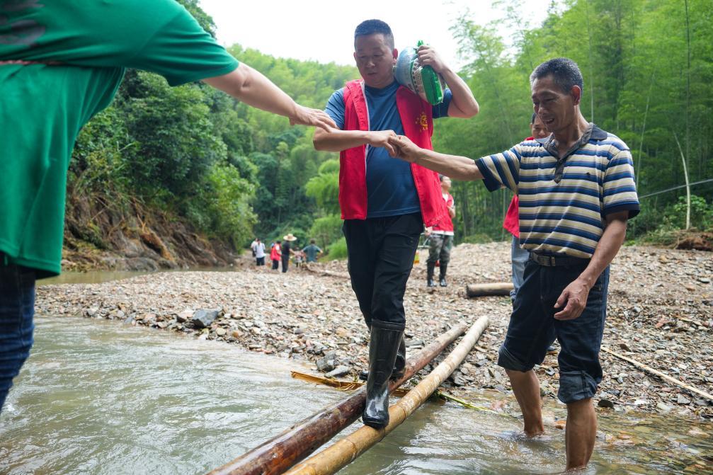 随着洪水渐渐退去,当地政府组织挖掘机紧急抢通一条便道,供行人通行。25日中午,一支志愿者队伍徒步7.3公里进入竹园村五组,为当地受灾群众运送物资。