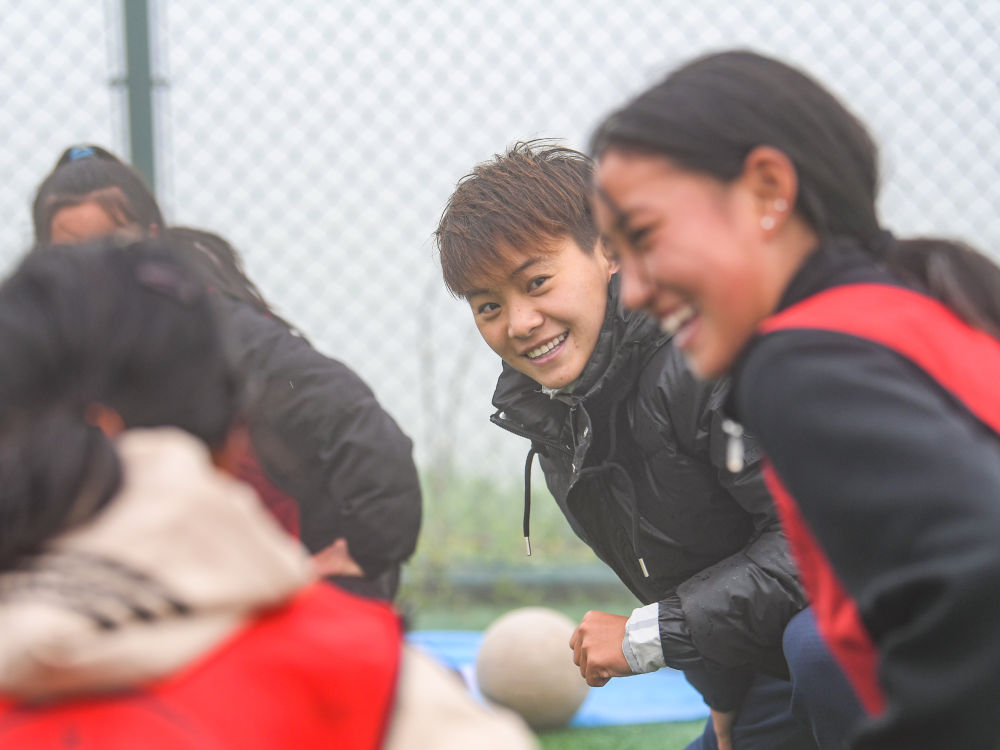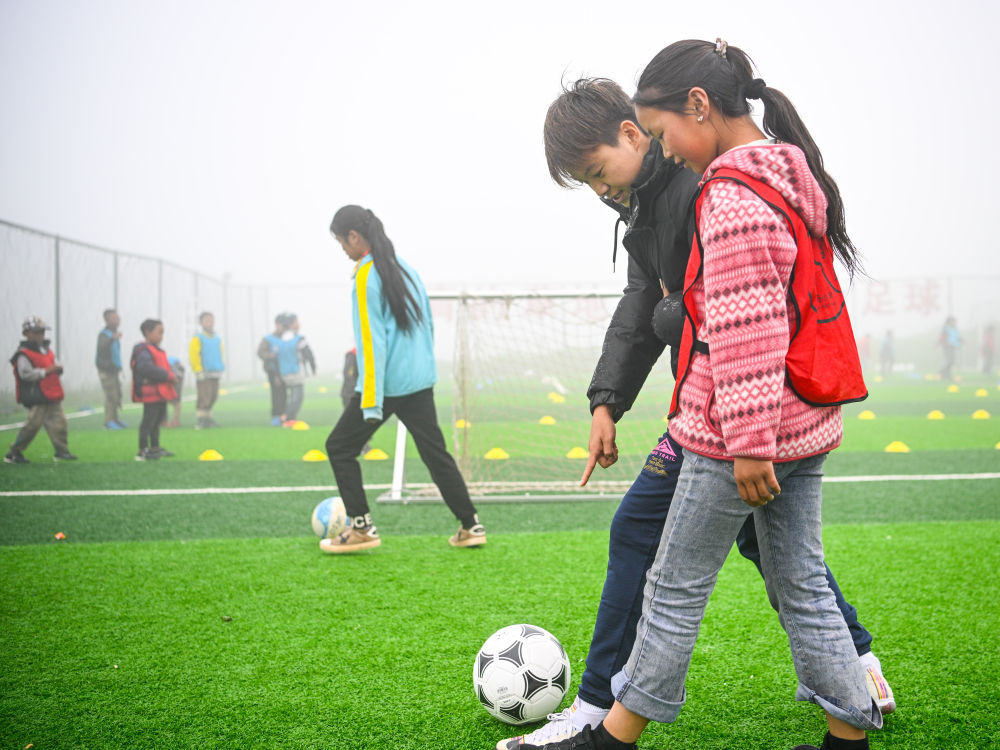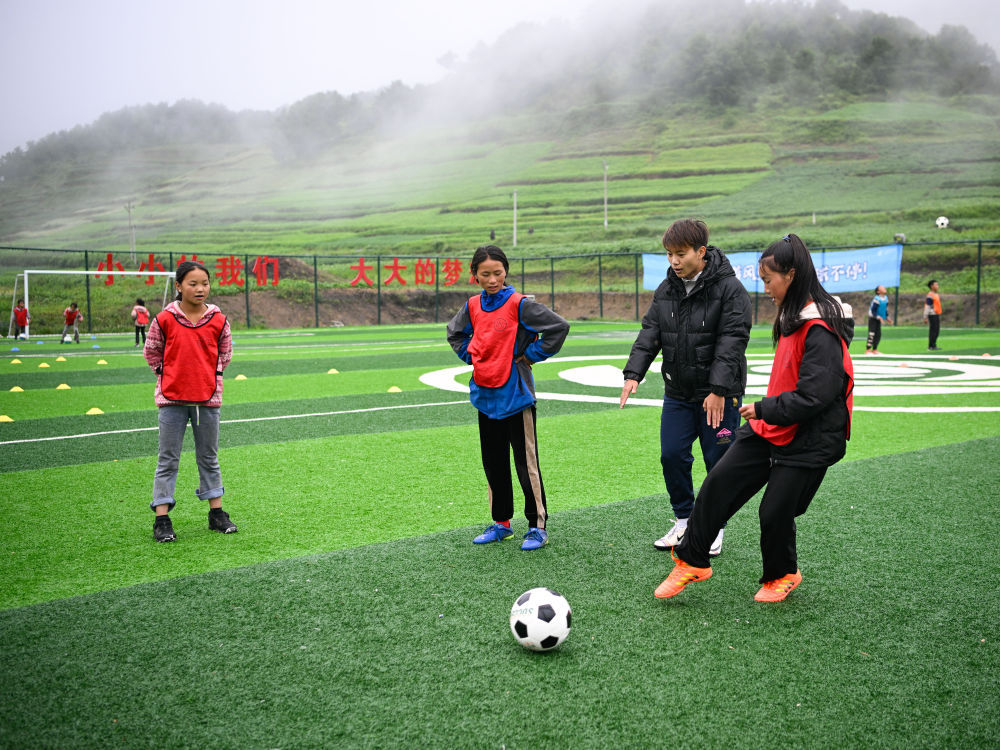 “大家看,用脚弓内侧把球送出去,尽量送到队友的脚下,左右脚都要用起来。”在球场中央二十来个小球员的围绕下,记者有些忐忑地和王霜一道做起示范来。“下面我们用正脚背触球,这样球速更快,大家尽量让球贴地……”不一会儿,队员们两两成组,清脆的触球声回响在大凉山的山间。