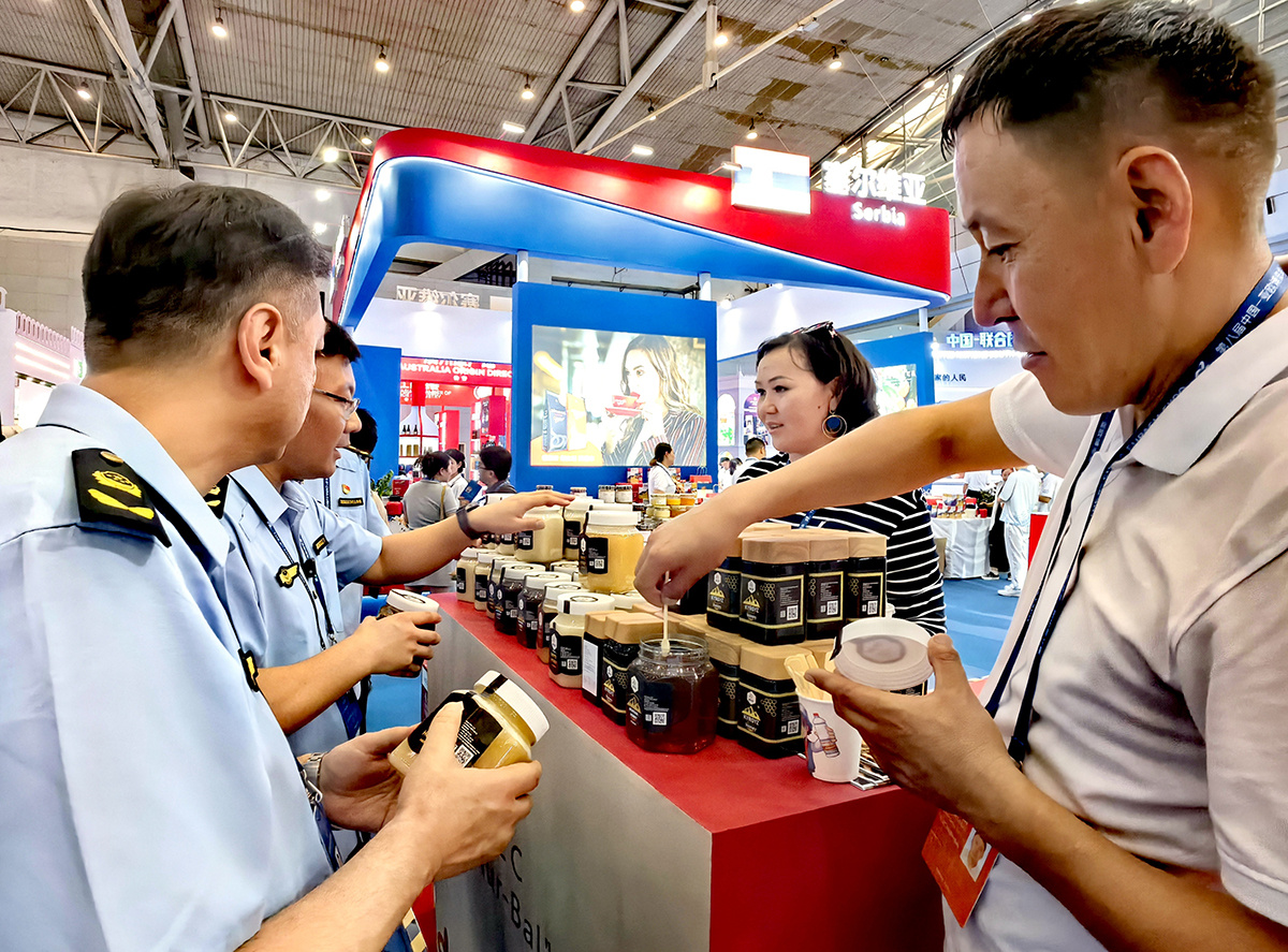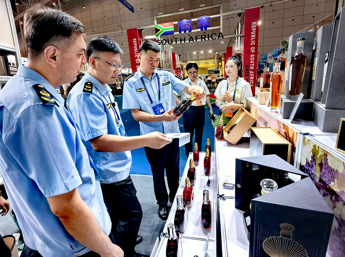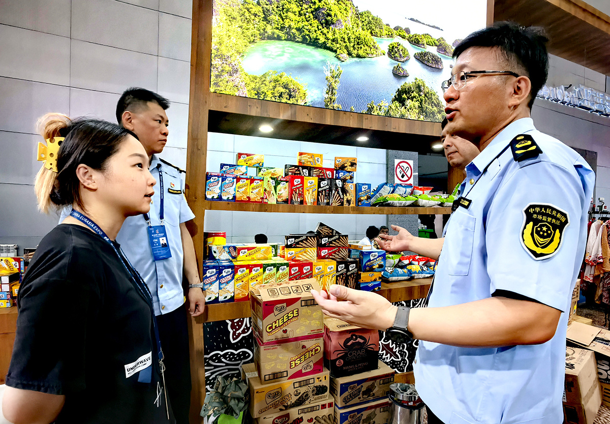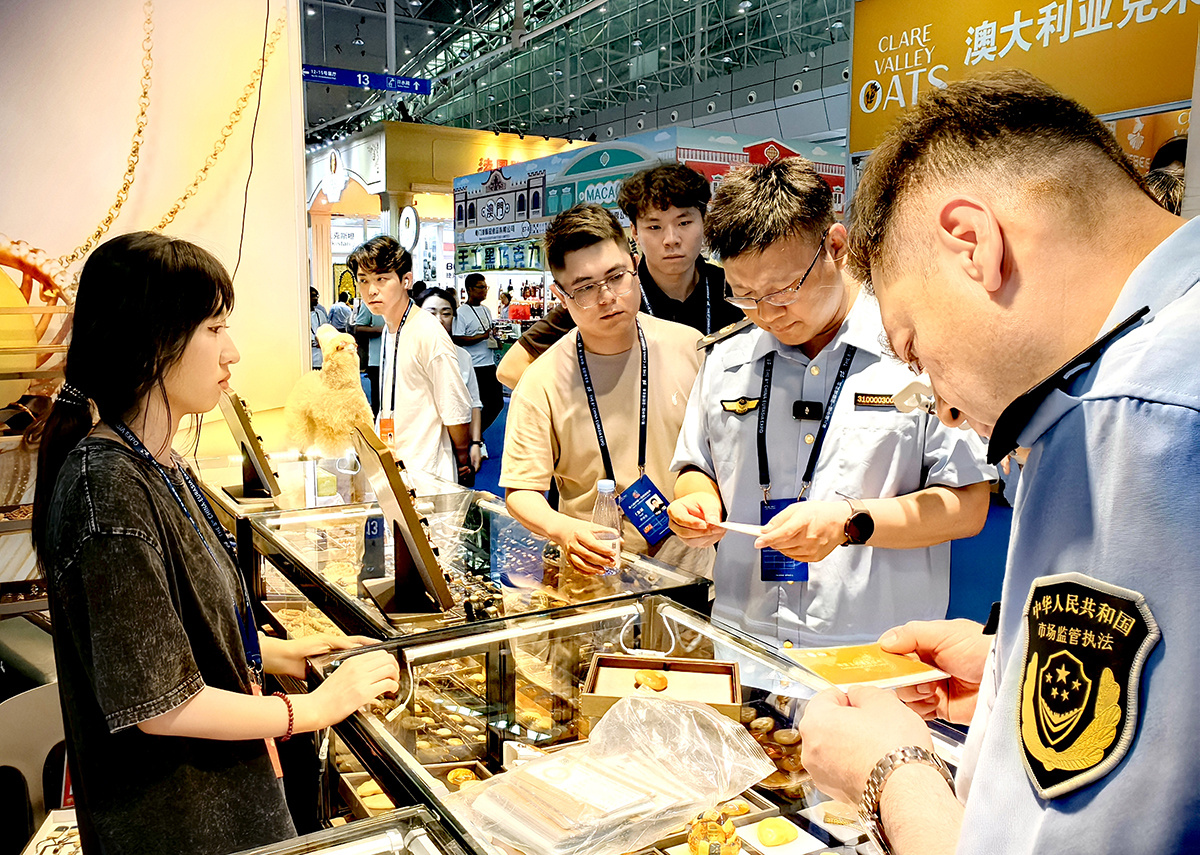 图为6月26日,新疆维吾尔自治区市场监督管理局展会工作站的工作人员正在展馆内对相关参展企业的产品质量进行例行巡查,并开展药品安全、产品质量、工业产品法律法规咨询和12315维权业务咨询服务。李唯祎 摄