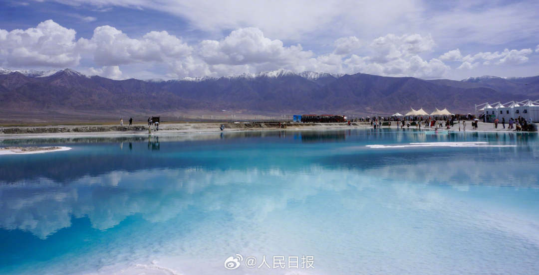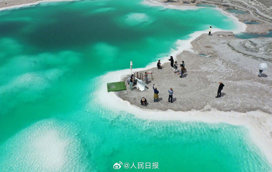 6月26日,青海海西州,大柴旦翡翠湖斑斓景色让人陶醉。翡翠湖是高海拔盐湖,盐池内或淡青、或翠绿、或湛蓝等色彩的湖水交相辉映,晶莹剔透,宛如一块块“翡翠”镶嵌在大地上。