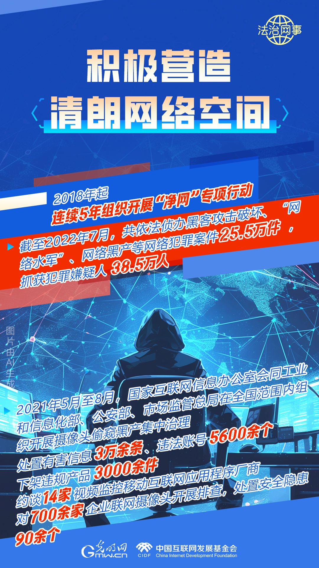 2018年起,连续5年组织开展“净网”专项行动。截至2022年7月,共依法侦办黑客攻击破坏、“网络水军”、网络黑产等网络犯罪案件25.5万件,抓获犯罪嫌疑人38.5万人。