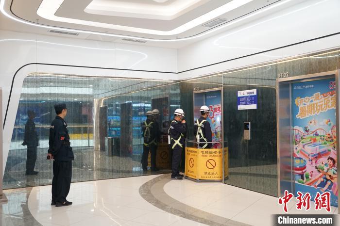 图为演练现场,轿厢救援组抵达乘客被困就近楼层,并做好现场救援安全围蔽。马铭言 摄