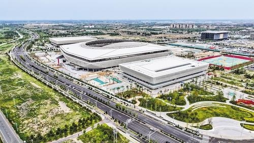 6月16日,无人机航拍的雄安新区海岳大街。一条海岳大街串联“古今”,雄安体育中心、南阳遗址都在这条大街沿线。河北日报记者 耿辉 摄