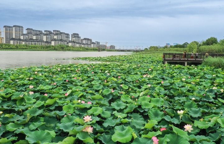 夏日清晨,富平石川河国家湿地公园,水流淙淙,荷花摇曳,水鸟嬉戏,鱼群畅游……这悠闲惬意的美景,引得不少行人纷纷拿出手机拍照记录。
