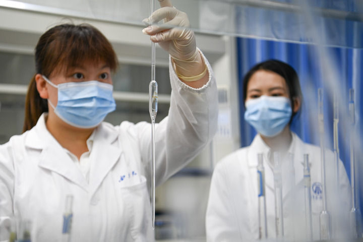 富平县南塬水厂城乡饮用水水质检测中心的工作人员在检测水质(6月22日摄)。新华社记者 邹竞一 摄