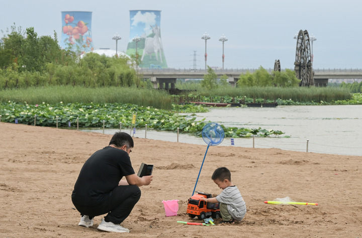 市民在富平石川河国家湿地公园岸边的沙地玩耍(6月21日摄)。新华社记者 李贺 摄