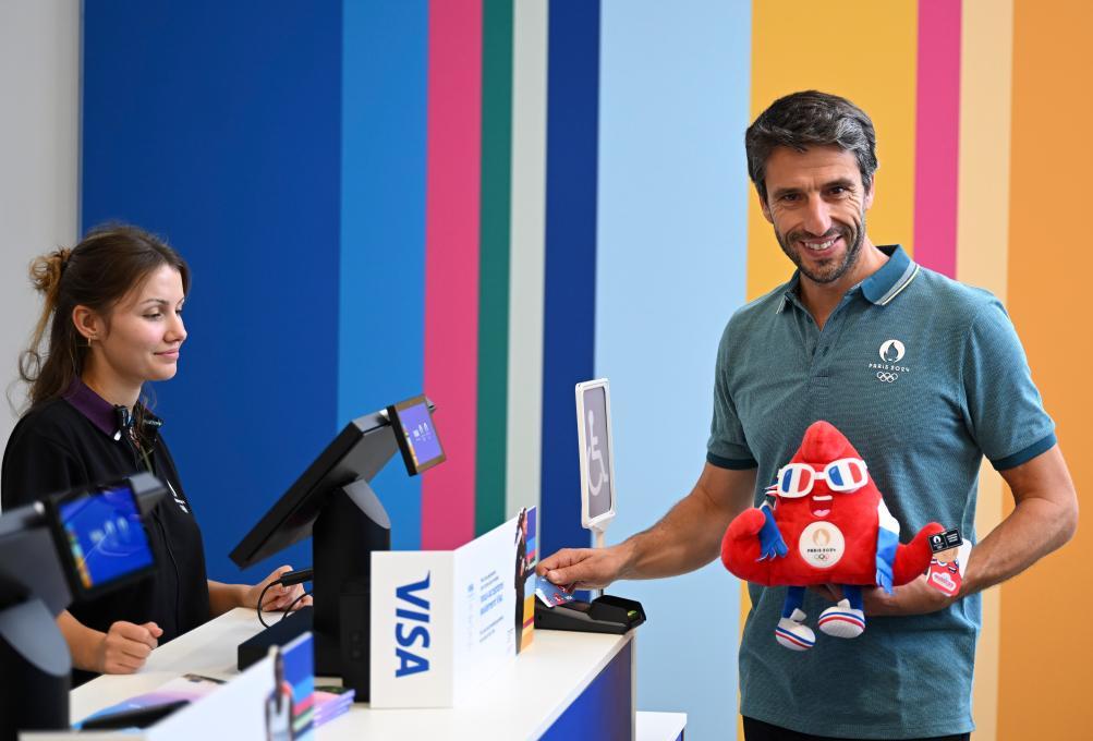 6月27日,巴黎奥组委主席托尼·埃斯坦盖(右)在巴黎奥运会官方特许商品旗舰店购买巴黎奥运会吉祥物“弗里热”周边纪念品。新华社记者 贺长山 摄