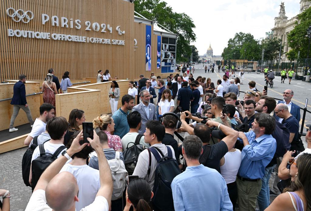 6月27日,巴黎奥组委主席托尼·埃斯坦盖在巴黎奥运会官方特许商品旗舰店外接受采访。新华社记者 贺长山 摄