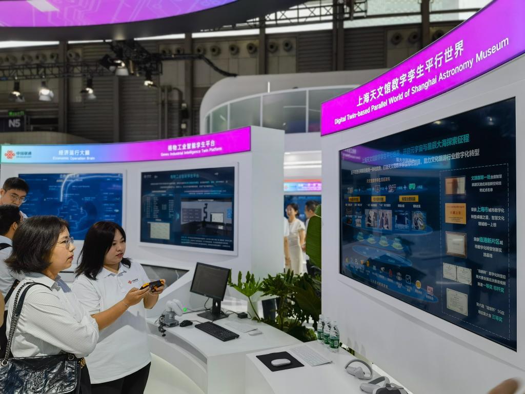 6月26日,观众在中国联通展台体验“上海天文馆数字孪生平行世界”。新华社记者 陈爱平 摄