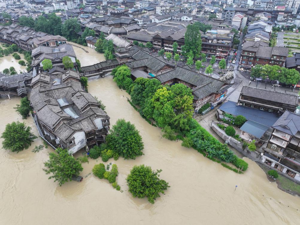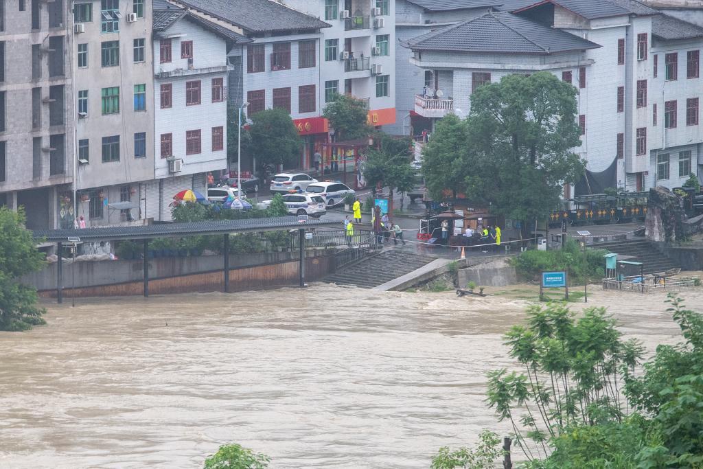 6月28日,重庆黔江区濯水镇,阿蓬江出现超保证水位洪水。新华社记者唐奕 摄
