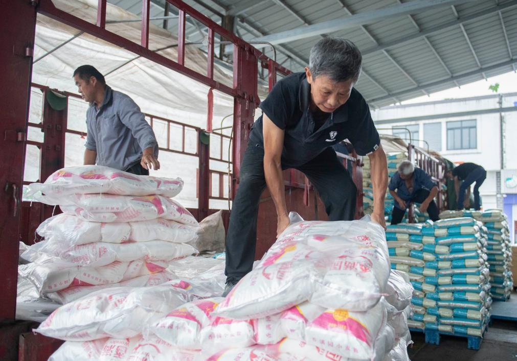 6月28日,在位于黄山市屯溪区的黄山市金徽源贸易有限公司粮油仓库,装卸工人从货车上卸下公司为应对暴雨加急采购的米面物资。新华社记者傅天 摄