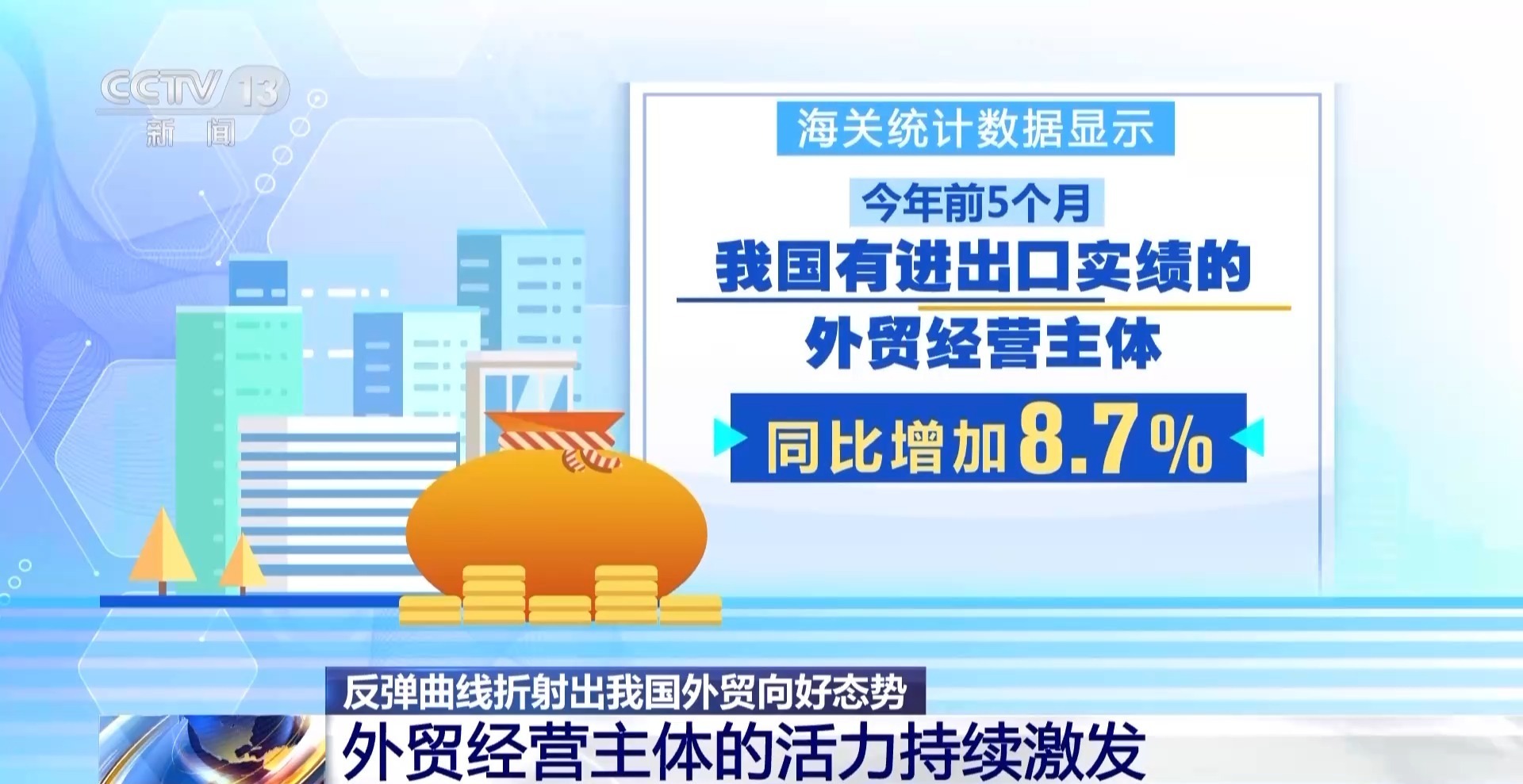 海关统计数据显示,今年前5个月,我国有进出口实绩的外贸经营主体同比增加8.7%,其中,民营企业数量增加10.1%,进出口值增长11.5%,占我国外贸比重较去年同期提升2.6个百分点至54.7%。