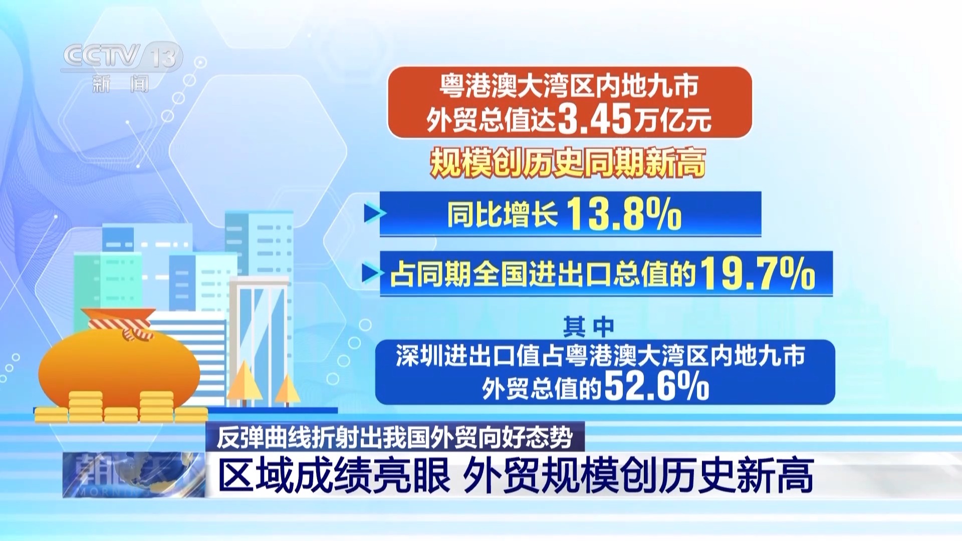 粤港澳大湾区内地九市外贸总值达3.45万亿元,规模创历史同期新高,同比增长13.8%,占同期全国进出口总值的19.7%。其中,深圳进出口值占粤港澳大湾区内地九市外贸总值的52.6%。