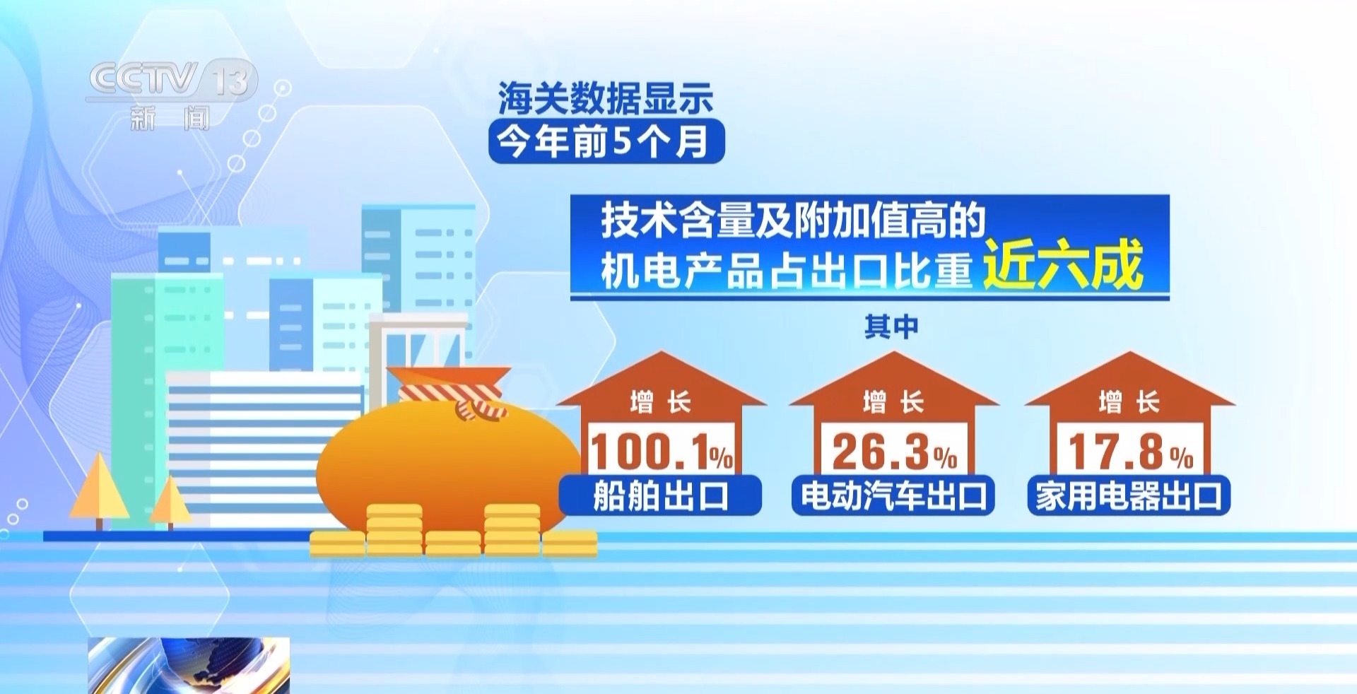 海关数据显示,今年前5个月,技术含量及附加值高的机电产品占出口比重近六成。其中,船舶、电动汽车、家用电器出口分别增长100.1%、26.3%、17.8%。