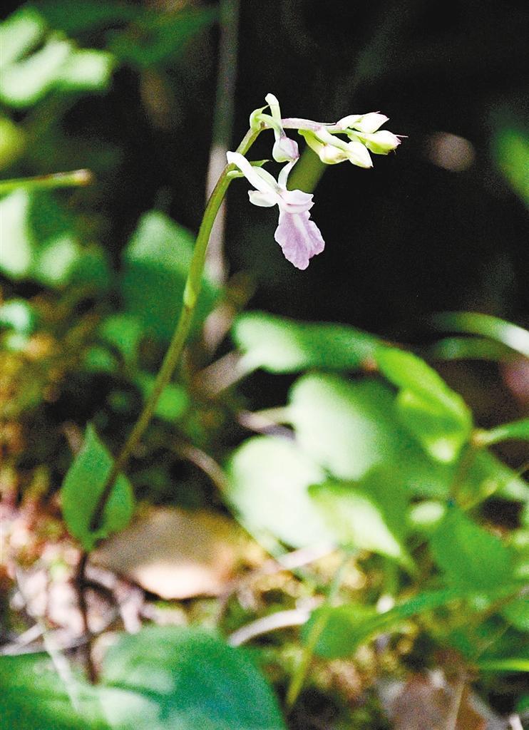 粗距舌喙兰数量稀少,分布范围小,此次共发现三株粗距舌喙兰,其中一株正值花期,植株高约30cm,株顶花簇一朵盛开,六蕾相伴,呈淡紫色,清新素雅,别具神韵。