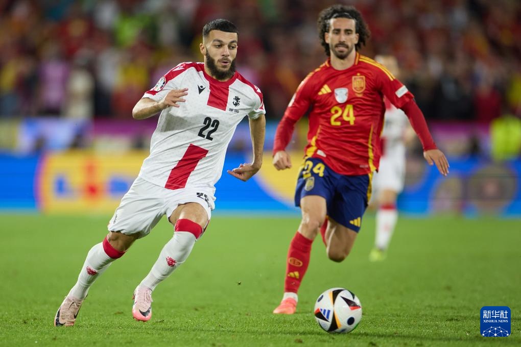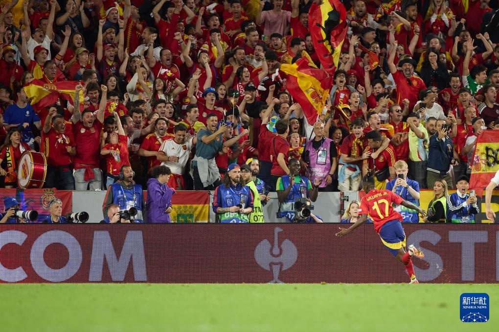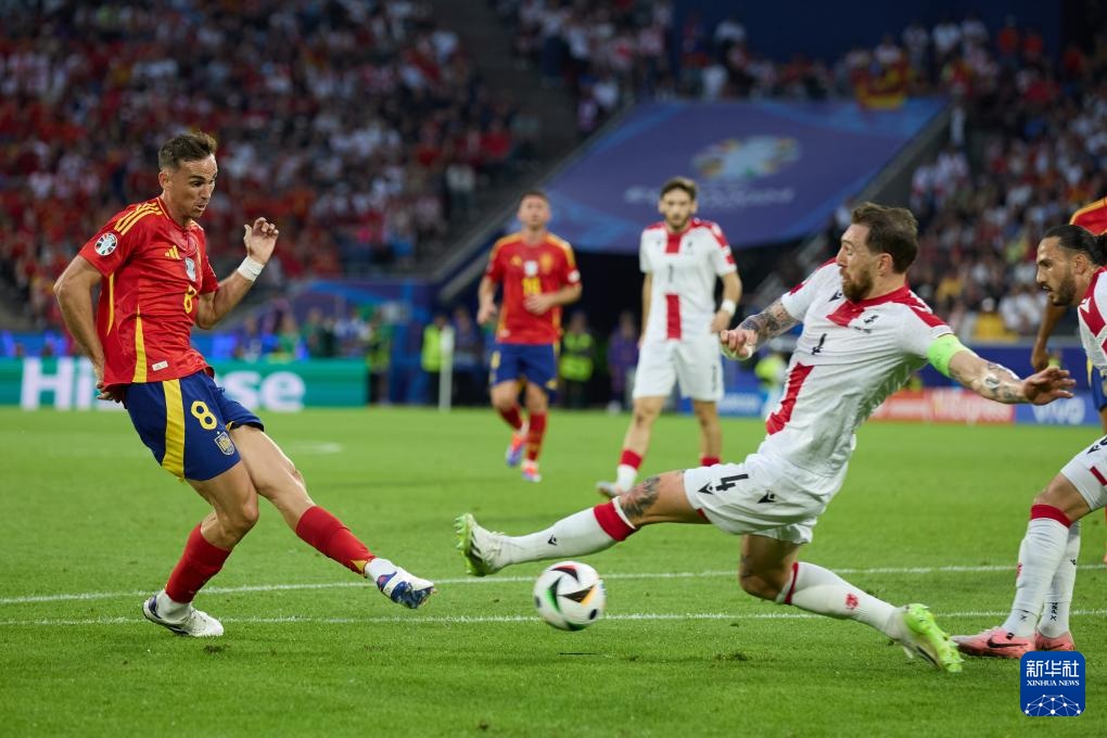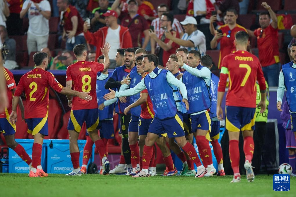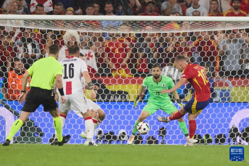 当日,在德国科隆进行的2024欧洲足球锦标赛八分之一决赛中,西班牙队4比1战胜格鲁吉亚队,晋级八强。