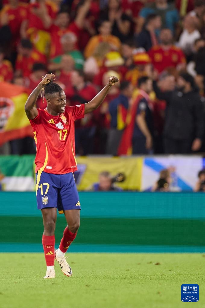 6月30日,西班牙队球员尼科·威廉姆斯在比赛中庆祝进球。新华社记者 孟鼎博 摄