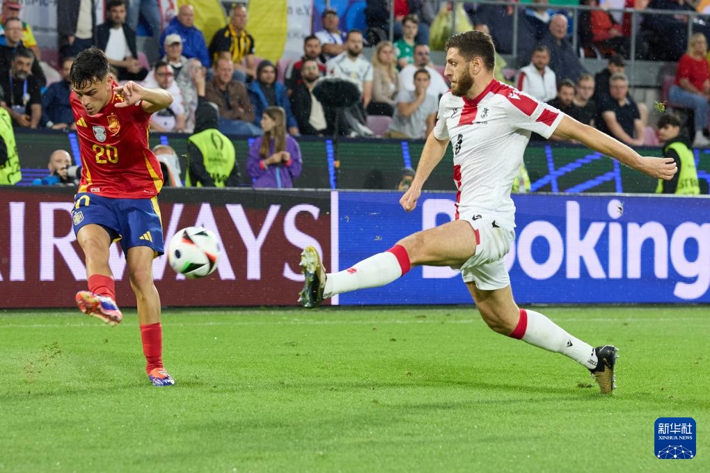 6月30日,西班牙队球员佩德里(左)与格鲁吉亚队球员布杜·日夫齐瓦泽在比赛中拼抢。新华社记者 孟鼎博 摄