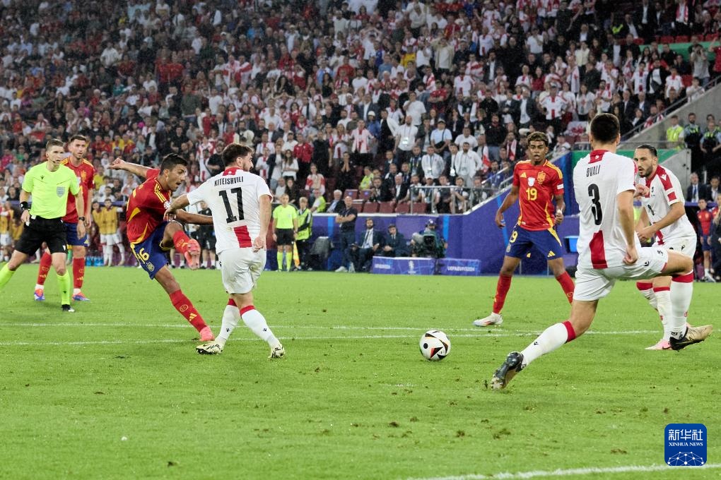 6月30日,西班牙队球员罗德里(左三)在比赛中破门得分。新华社记者 孟鼎博 摄