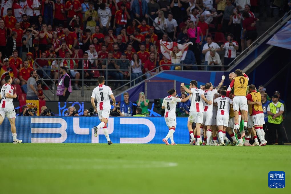 6月30日,格鲁吉亚队球员在比赛中庆祝进球。新华社记者 孟鼎博 摄