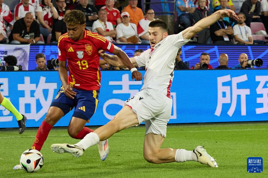 6月30日,西班牙队球员拉明·亚马尔(左)与格鲁吉亚队球员卢卡·洛乔什维利在比赛中拼抢。新华社记者 孟鼎博 摄
