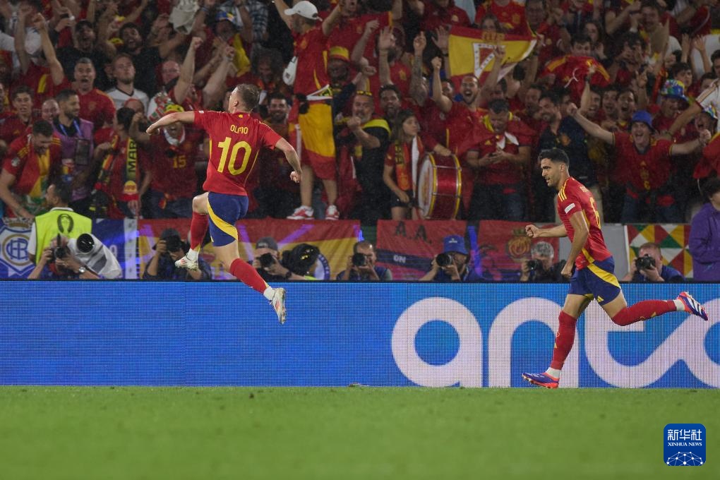 6月30日,西班牙队球员丹尼尔·奥尔莫(左)在比赛中庆祝进球。新华社记者 孟鼎博 摄