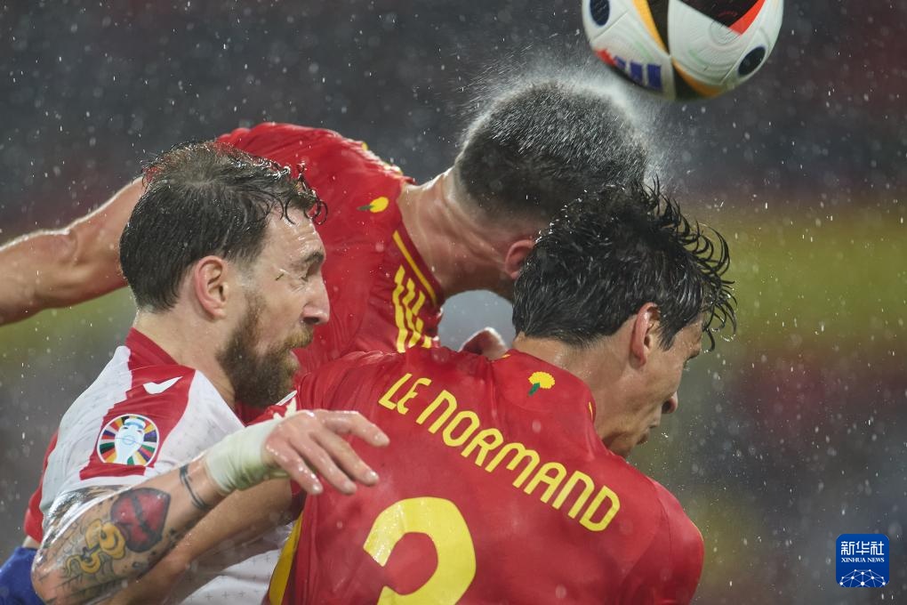 6月30日,西班牙队球员艾默里克·拉波尔特(中)、罗温·勒诺尔芒(右)与格鲁吉亚队球员赫维察·克瓦拉茨赫利亚在比赛中争顶头球。新华社记者 孟鼎博 摄