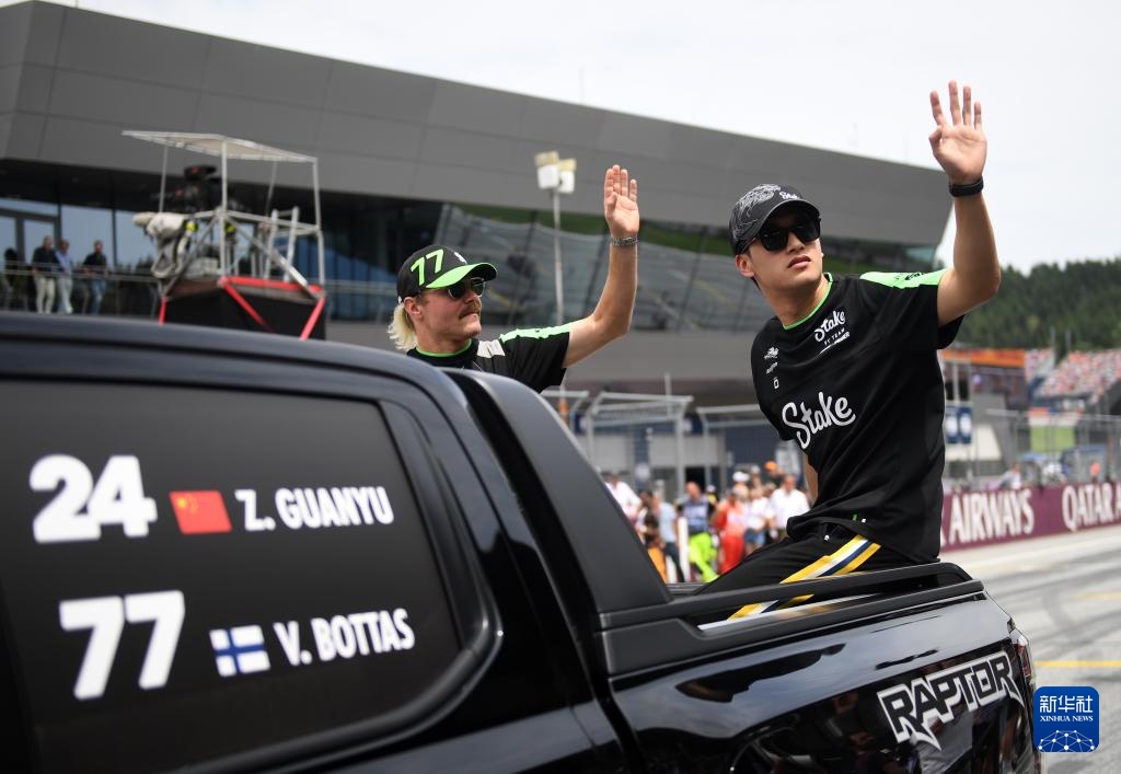 6月30日,索伯车队中国车手周冠宇(右)参加赛前车手巡游仪式。新华社记者 贺灿铃 摄