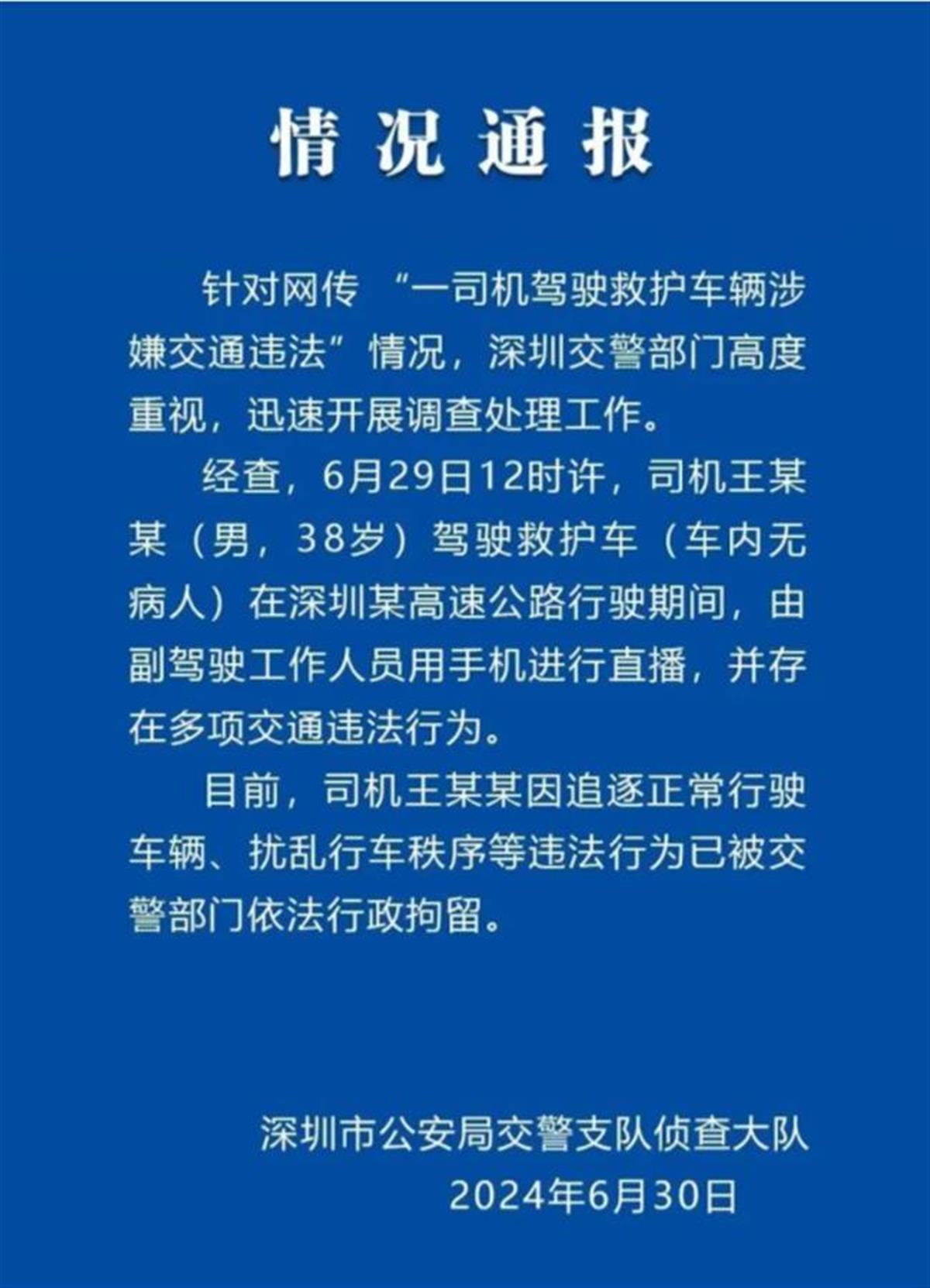 6月30日晚,针对此视频,当地交警部门发布情况通报称:经查,6月29日12时许,司机王某某(男,38岁)驾驶救护车(车内无病人)在深圳某高速公路行驶期间,由副驾驶工作人员用手机进行直播,并存在多项交通违法行为。目前,司机王某某因追逐正常行驶车辆、扰乱行车秩序等违法行为已被交警部门依法行政拘留。(据7月1日红星新闻报道)