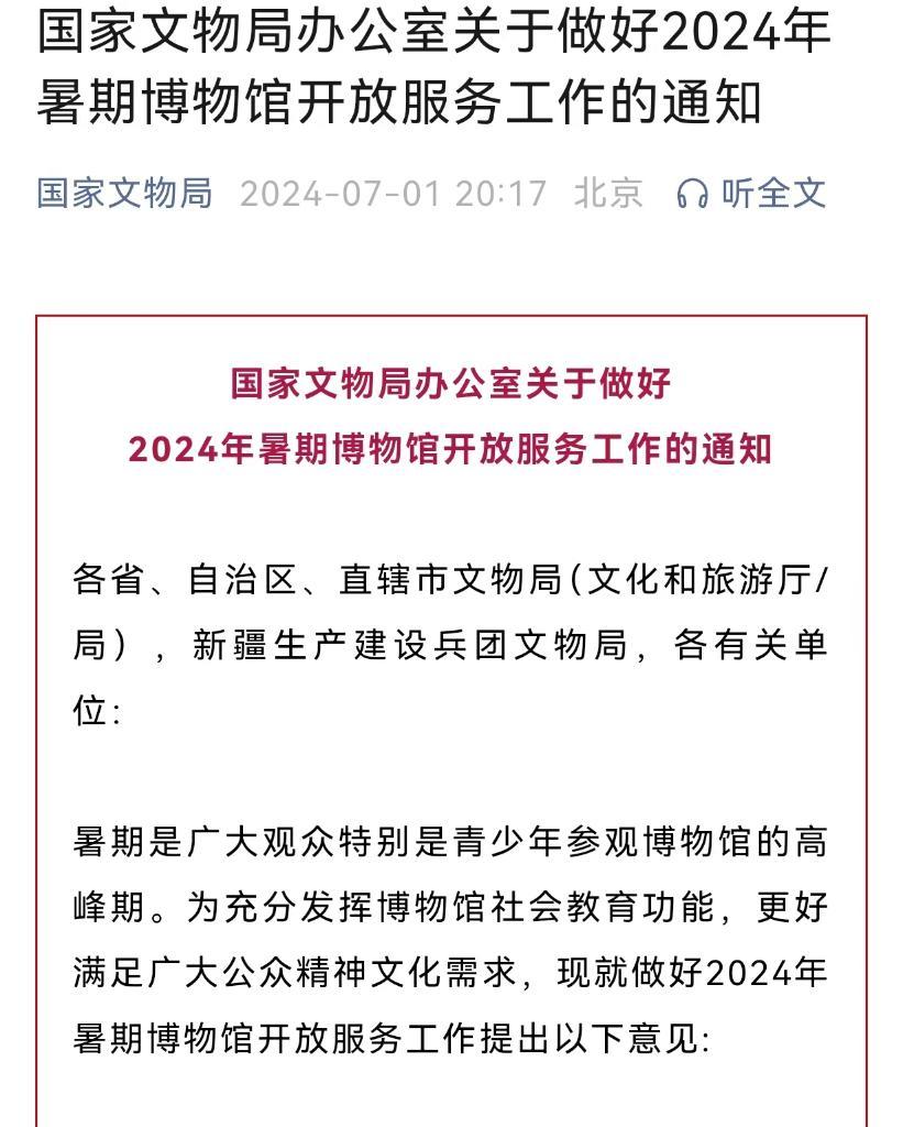 国家文物局7月1日发出通知,就做好2024年暑期博物馆开放服务工作进行部署。通知明确,各级文物行政主管部门要加强指导,科学评估场馆承载量,创新举措,通过多种方式提高观众参观博物馆便利化水平。