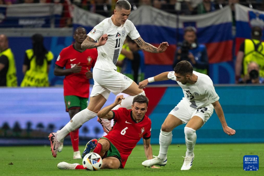 7月1日,葡萄牙队球员帕利尼亚(中)与斯洛文尼亚队球员本杰明·塞斯科(左)拼抢。新华社记者 肖艺九 摄