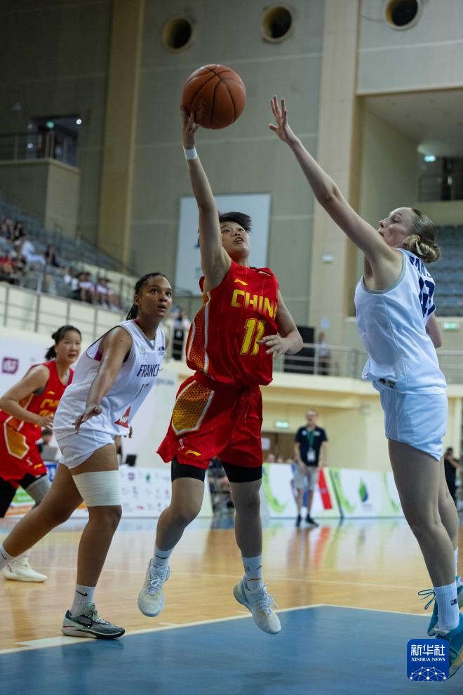 7月2日,中国队球员徐紫奇(前中)在比赛中上篮。新华社记者 张金加 摄