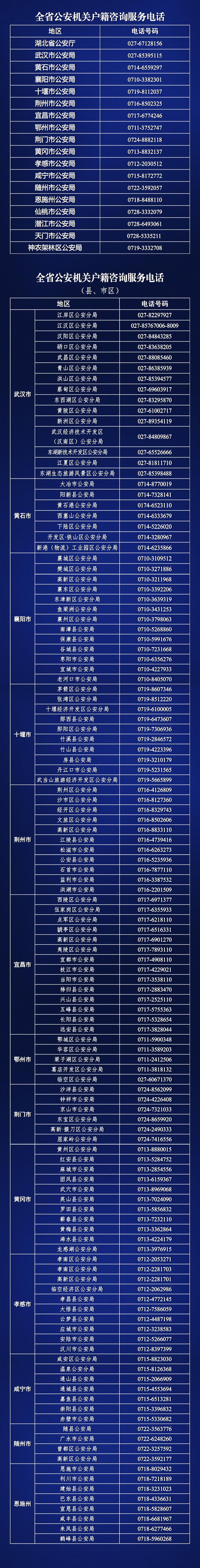 即日起,湖北省公安厅向社会公开省、市、县三级治安户政部门业务咨询服务电话,在工作时间内接听、答复群众办理户口、居民身份证、居住证等业务咨询。