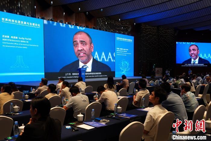 第七届世界科技社团发展与治理论坛在广西南宁举行,美国科学促进会首席执行官苏迪普·帕里赫视频寄语。中新网记者 孙自法 摄